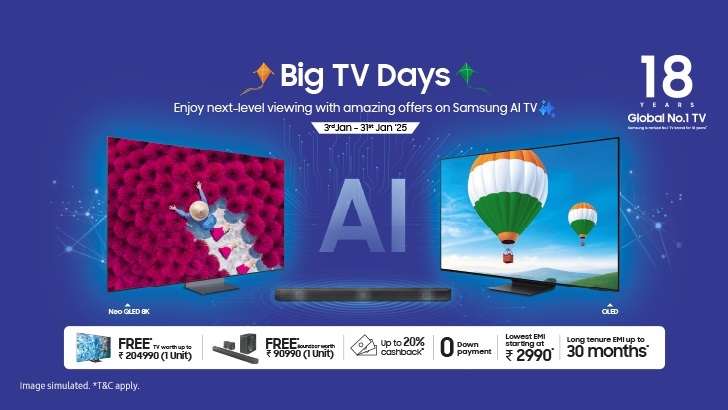 Samsung India, the country’s largest consumer electronics brand, has introduced the ‘Big TV Days’ campaign to celebrate the New Year and Republic Day season. This exclusive campaign, running from January 3 to January 31, 2025, offers exceptional deals on Samsung’s premium TV lineup, including Neo QLED, OLED, and 4K UHD TVs. By combining innovative technology, premium design, and unbeatable value, Samsung aims to redefine the home entertainment experience for Indian consumers